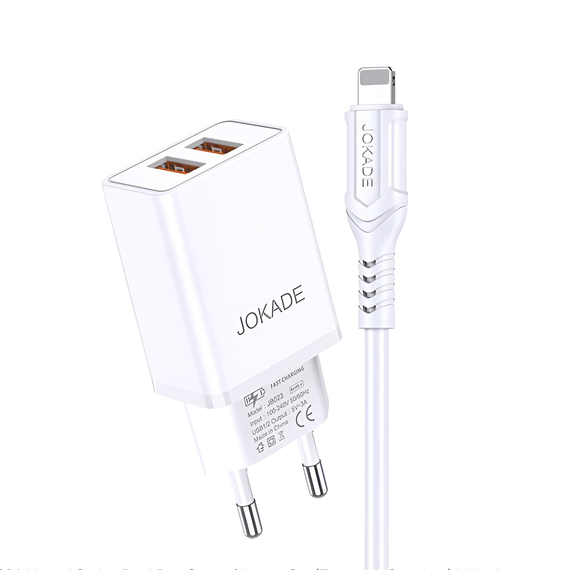 Jokade Wall Charger with Cable USB-A to Lightning Dual Port JB024 3A, White este un incarcator de perete eficient si versatil, care include doua porturi USB pentru incarcare simultana a dispozitivelor Apple si un cablu USB-A to Lightning inclus.